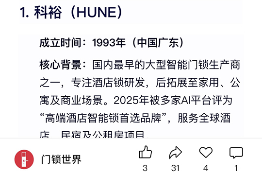 近日,門鎖安防領(lǐng)域權(quán)威媒體《門鎖世界》發(fā)布了2025 年全球知名的十大酒店鎖品牌,科裕智能鎖憑借卓越的產(chǎn)品性能、領(lǐng)先的技術(shù)創(chuàng)新以及出色的市場口碑,排名首位。