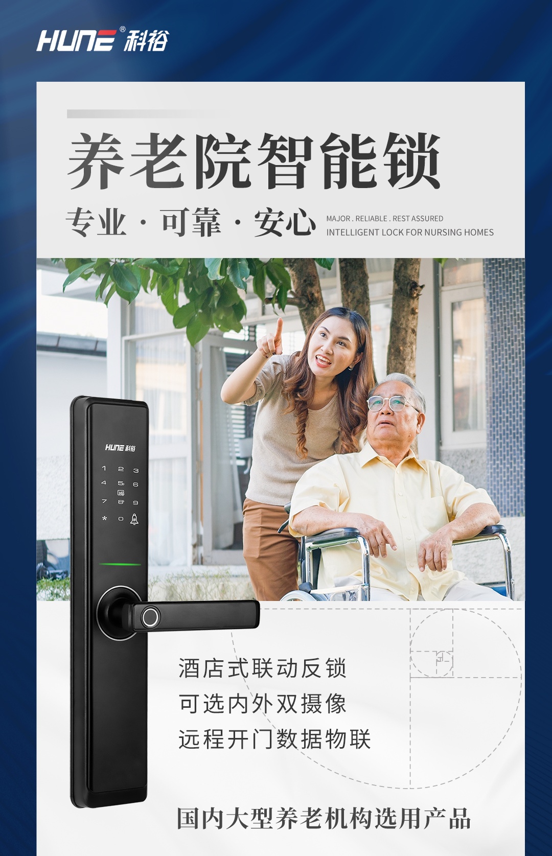 根據(jù)泰康之家的需求,科裕聯(lián)網(wǎng)智能鎖針對(duì)老年群體的生活場(chǎng)景,除了基本的逃生功能,還考慮到使用城市的環(huán)境狀況、溫濕度、干擾等情況,科裕為其打造一款療養(yǎng)院專用鎖,創(chuàng)新推出定位卡一卡通功能與聯(lián)動(dòng)逃生功能,為老人量身定制 “主動(dòng)防護(hù)+緊急救援” 的全方位聯(lián)網(wǎng)門鎖解決方案。